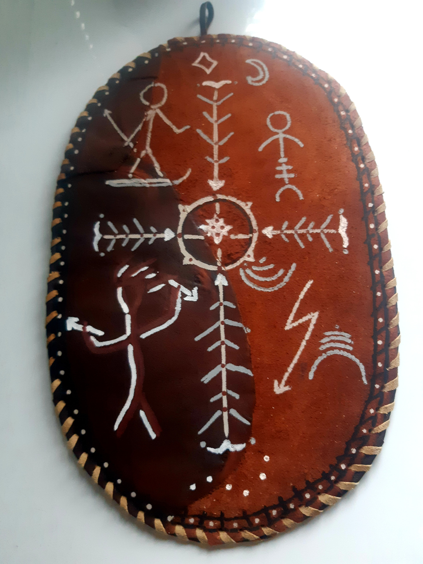 Kierrätetystä nahasta käsinvalmistettu taulu. Akryylimaalattu. Koko 29 x 20cm